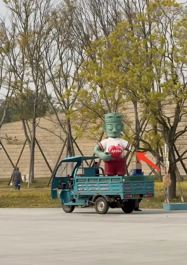 网友发布的帖子称,在三星堆博物馆一号馆外,看见一尊手抱爱心的青铜造型雕塑手臂断裂,随后被工作人员装车运走,“感觉有点心疼”。评论区内,不少网友对雕塑受损表示惋惜。