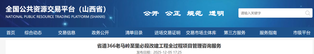 12月5日,山西省公共资源交易中心发布省道366老马岭至里必段改建工程全过程项目管理咨询服务招标计划。
