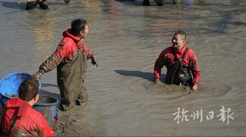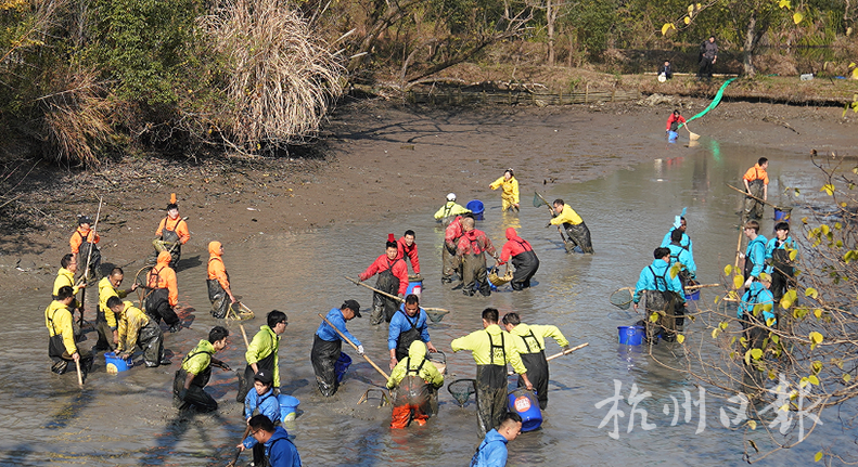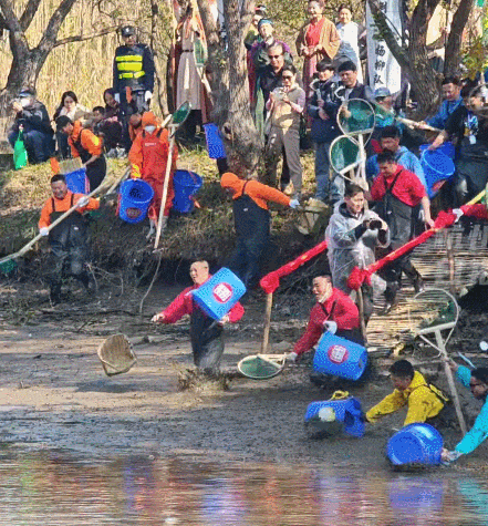 12月6日上午10点,60名“摸鱼高手”身着统一的下水裤,手持各式捞鱼工具,在岸边跃跃欲试。
