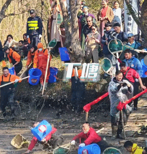随着“开塘官”一声令下,等候多时的“摸鱼”队伍呼啦啦冲下泥塘,平静的水面瞬间炸开了锅。