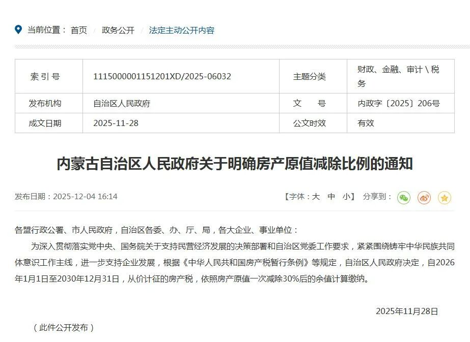 为深入贯彻落实党中央、国务院关于支持民营经济发展的决策部署和自治区党委工作要求,紧紧围绕铸牢中华民族共同体意识工作主线,进一步支持企业发展,根据《中华人民共和国房产税暂行条例》等规定,自治区人民政府决定,自2026年1月1日至2030年12月31日,从价计征的房产税,依照房产原值一次减除30%后的余值计算缴纳。