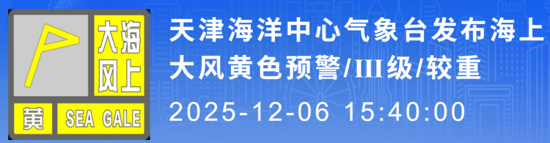 天津海洋中心气象台于2025年12月06日15时40分发布海上大风黄色预警信号:预计明天上午到夜间,天津港锚地海域、渤海中部海域将有北到西北风6-7级阵风8-9级,其中明天下午风力增大,有7-8级阵风9-10级,请有关单位和人员做好防范准备。