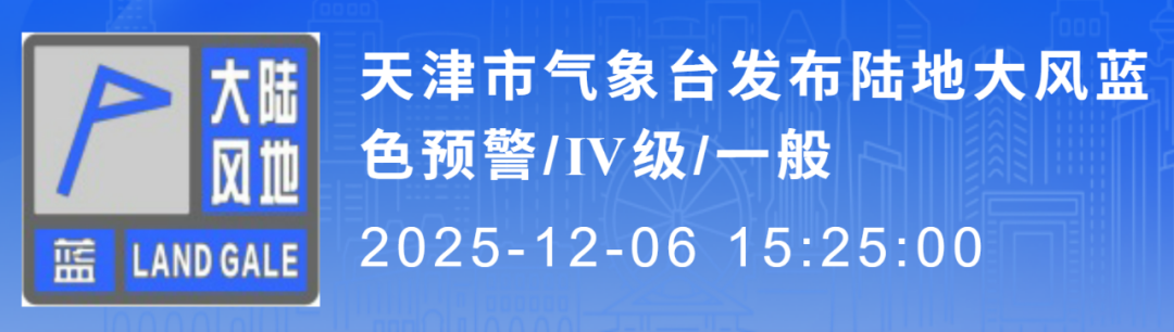 天津市气象台于2025年12月06日15时25分发布陆地大风蓝色预警信号:预计明天早晨到前半夜,我市将有西北风4-5级阵风7-8级,请有关单位和人员做好防范准备。
