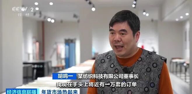 某纺织科技有限公司董事长 胡鸣一:我现在手头上将近有一万套的订单,大概三十几个款。一万套的订单差不多要做到12月底。有一些外贸企业,包括一些海外购的电商平台也会来找我们采购。