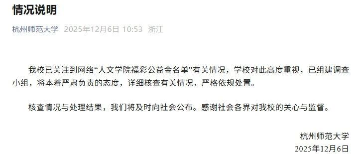 我校已关注到网络“人文学院福彩公益金名单”有关情况,学校对此高度重视,已组建调查小组,将本着严肃负责的态度,详细核查有关情况,严格依规处置。核查情况与处理结果,我们将及时向社会公布。感谢社会各界对我校的关心与监督。