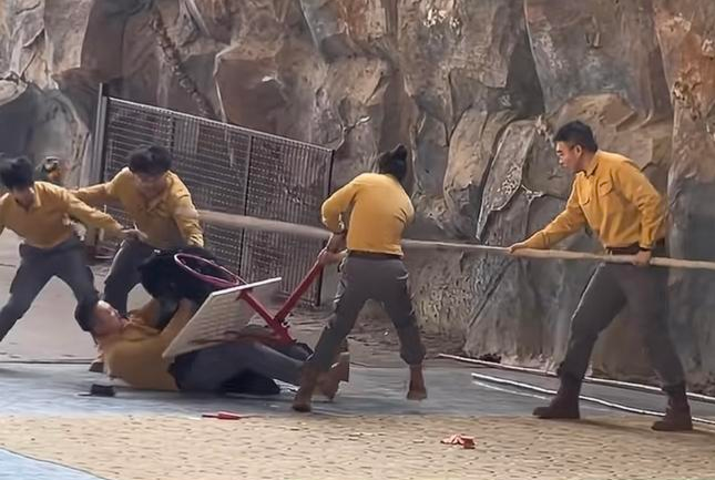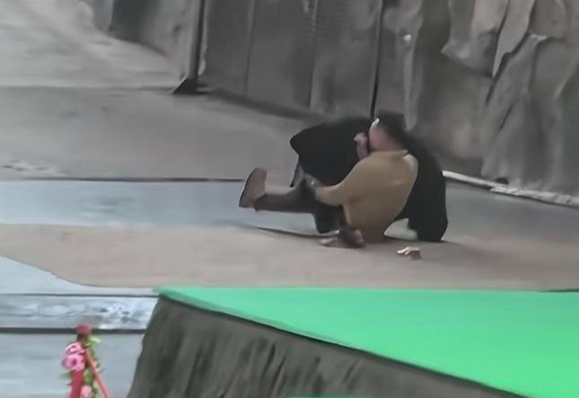 从网友发布的视频可以看到,当时,两只亚洲黑熊结束了滑板表演,正准备进行“开心三连跳”表演,前一只黑熊已经上台,后面正在候场的那只黑熊突然转身,与饲养员发生拉扯,并瞬间将饲养员推倒在地。旁边一位女性工作人员用手中的塑料凳敲打黑熊无果,又试图用手将其拉开。随后,又跑来三名工作人员。其间,黑熊一度被制服,但当被攻击的饲养员再度上前时,拉扯再次发生。最终,5名工作人员一起将黑熊拉到了后台。