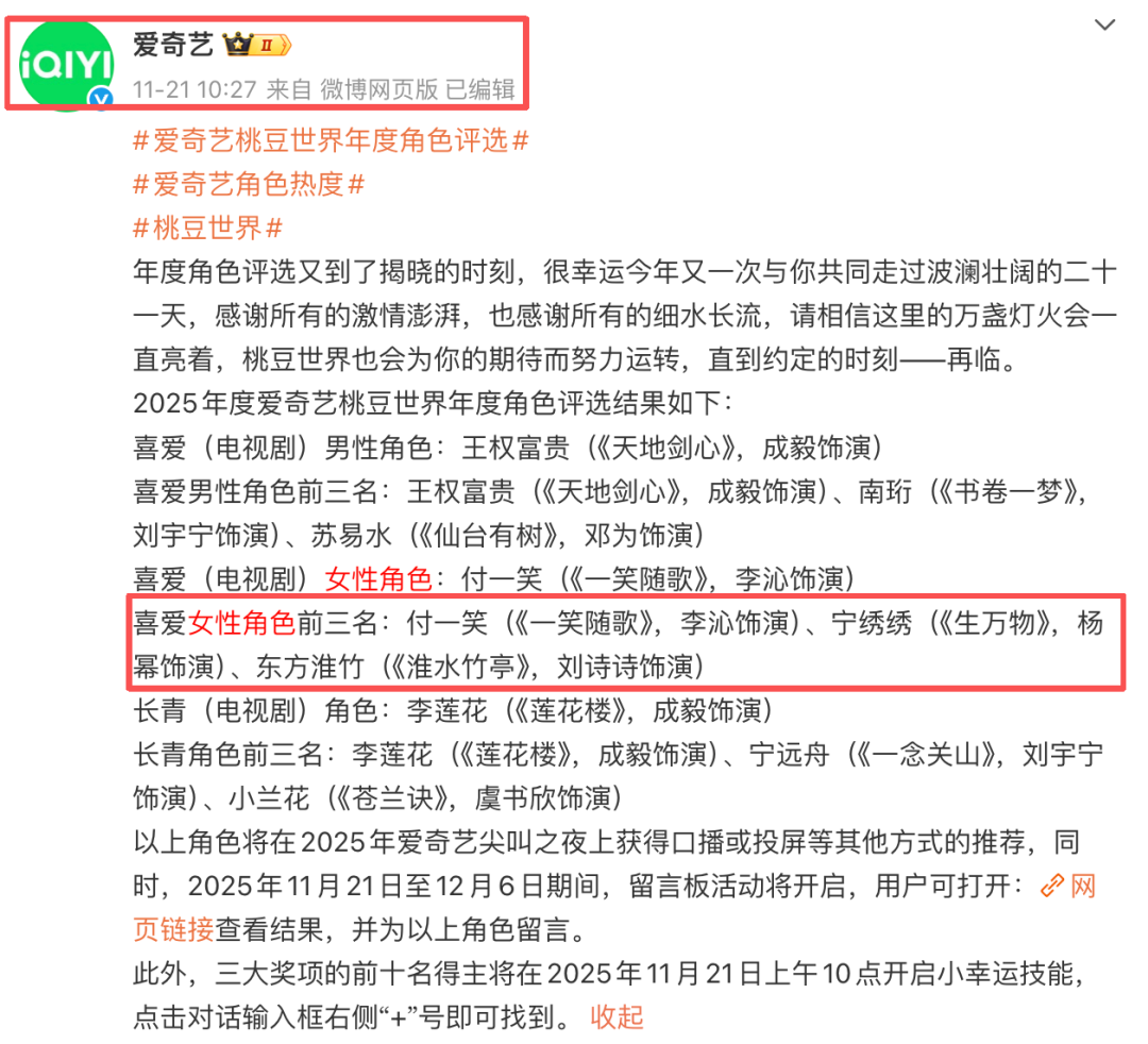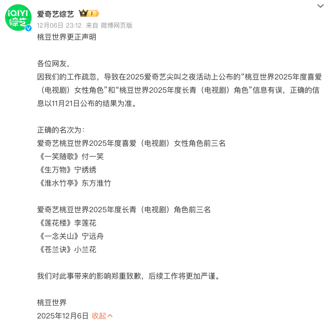 各位网友,因我们的工作疏忽,导致在2025爱奇艺尖叫之夜活动上公布的“桃豆世界2025年度喜爱(电视剧)女性角色”和“桃豆世界2025年度长青(电视剧)角色”信息有误,正确的信息以11月21日公布的结果为准。