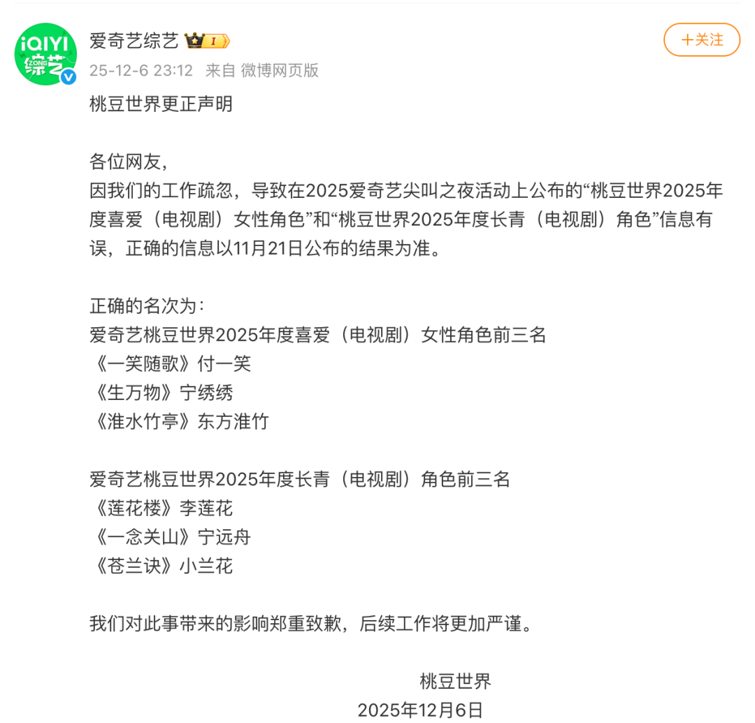 因工作疏忽,导致在2025爱奇艺尖叫之夜活动上公布的“桃豆世界2025年度喜爱(电视剧)女性角色”和“桃豆世界2025年度长青(电视剧)角色”信息有误,正确的信息以11月21日公布的结果为准。对此事带来的影响郑重致歉,后续工作将更加严谨。