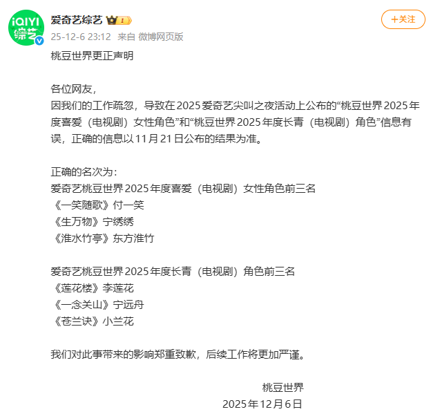 因我们的工作疏忽,导致在2025爱奇艺尖叫之夜活动上公布的“桃豆世界2025年度喜爱(电视剧)女性角色”和“桃豆世界2025年度长青(电视剧)角色”信息有误,正确的信息以11月21日公布的结果为准。