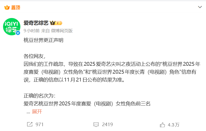 当晚,@爱奇艺综艺 发布更正声明:“各位网友,因我们的工作疏忽,导致在2025爱奇艺尖叫之夜活动上公布的“桃豆世界2025年度喜爱(电视剧)女性角色”和“桃豆世界2025年度长青(电视剧)角色”信息有误,正确的信息以11月21日公布的结果为准。