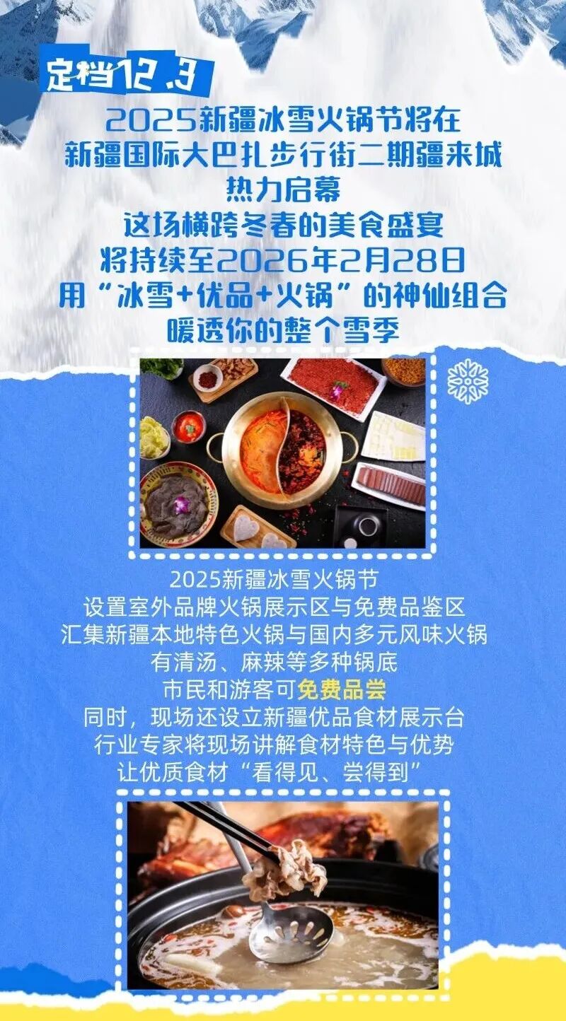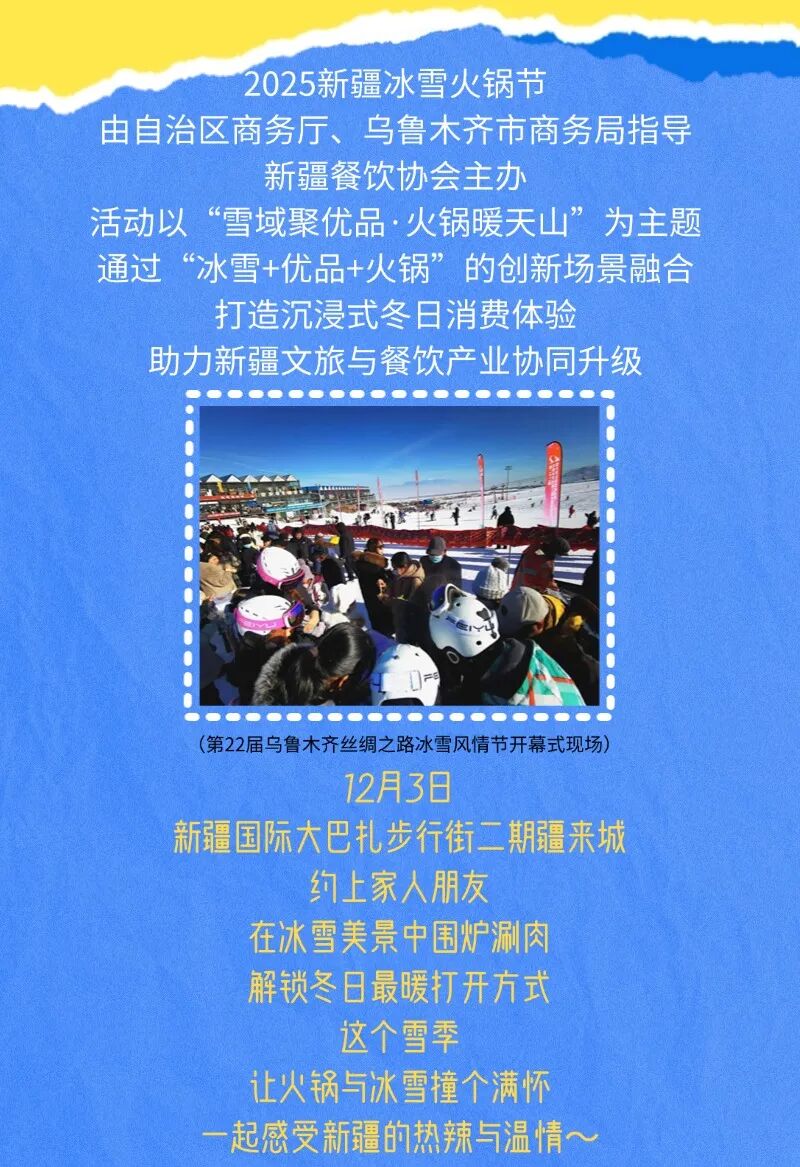 据了解,除了大巴扎步行街现场的活动,在新疆冰雪火锅节期间,全疆参与活动的火锅品牌门店与合作景区将同步推出特色活动,各火锅企业将统一悬挂活动标识,打造“冰雪火锅节”限定套餐与专属优惠;美团等合作平台将开设活动专区,每日定点秒杀火锅套餐与折扣代金券,市民和游客现场扫码即可领取包含火锅代金券、新疆优品火锅食材家庭装礼盒、冰雪景区门票折扣券在内的“暖冬消费礼包”,所有优惠券有效期覆盖至雪季结束。