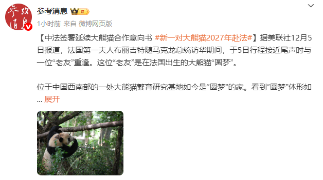 在马克龙总统此次访华期间,中国野生动物保护协会表示,已与法国签署意向书,将在2027年将两只大熊猫送往巴黎南部的博瓦勒野生动物园。这将是中法两国为期10年的新一轮大熊猫保护研究合作。
