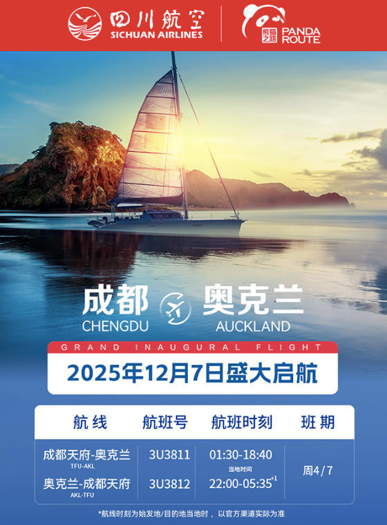 川航相关负责人告诉政事君,为配合航线复航,在7日当天首趟航班上,川航策划“蓉城遇见千帆”主题活动,将成都的烟火韵味与奥克兰的滨海风情带上万米高空。机上餐食除了四川特色风味,还特别准备了定制蛋糕。客舱互动环节精彩纷呈,乘务组将开展中新文化、航线知识有奖问答,参与旅客可获得川航与新西兰旅游局联合送出的专属纪念礼品。