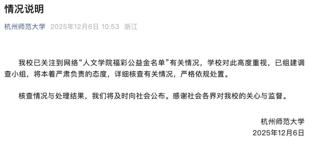我校已关注到网络“人文学院福彩公益金名单”有关情况,学校对此高度重视,已组建调查小组,将本着严肃负责的态度,详细核查有关情况,严格依规处置。
