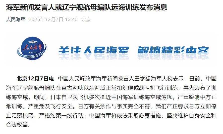 中国人民解放军海军新闻发言人王学猛海军大校表示,日前,中国海军辽宁舰航母编队在宫古海峡以东海域正常组织舰载战斗机飞行训练,事先公布了训练海空域。