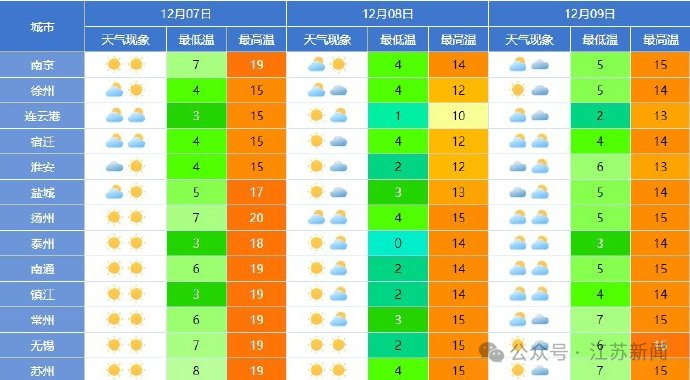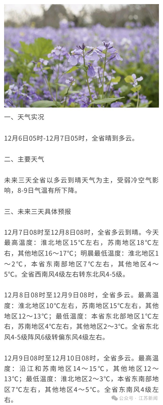 12月7日08时至12月8日08时,全省多云到晴。今天最高温度:淮北地区15℃左右,苏南地区18℃左右,其他地区16~17℃;明晨最低温度:淮北地区1~2℃,本省东南部地区7℃左右,其他地区4~5℃。全省西南风4级左右转东北风4-5级。