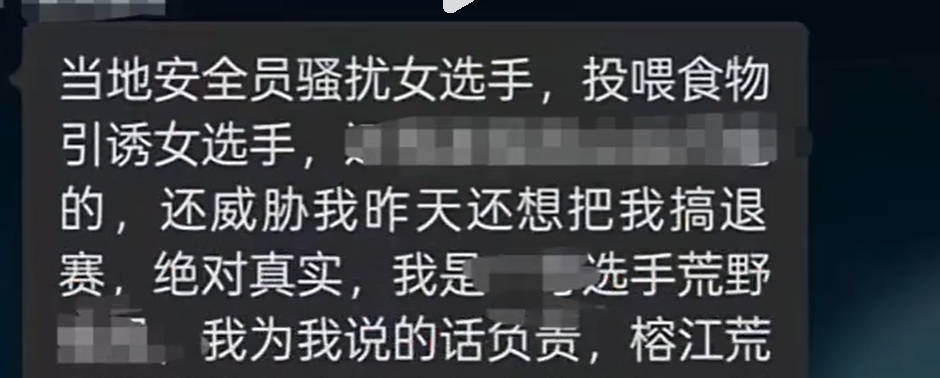 记者注意到,在网络上,关于该项赛事出现了不少质疑。有多名网友甚至自称是参赛者的网友称赛事存在“安全员骚扰女选手”“有安全员违规作弊投喂选手食物”等情况。