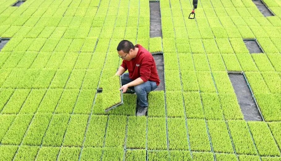 浙江省湖州市德清县洛舍镇东衡村先丰农业智能育秧工厂内,工人在观察早稻秧苗长势。