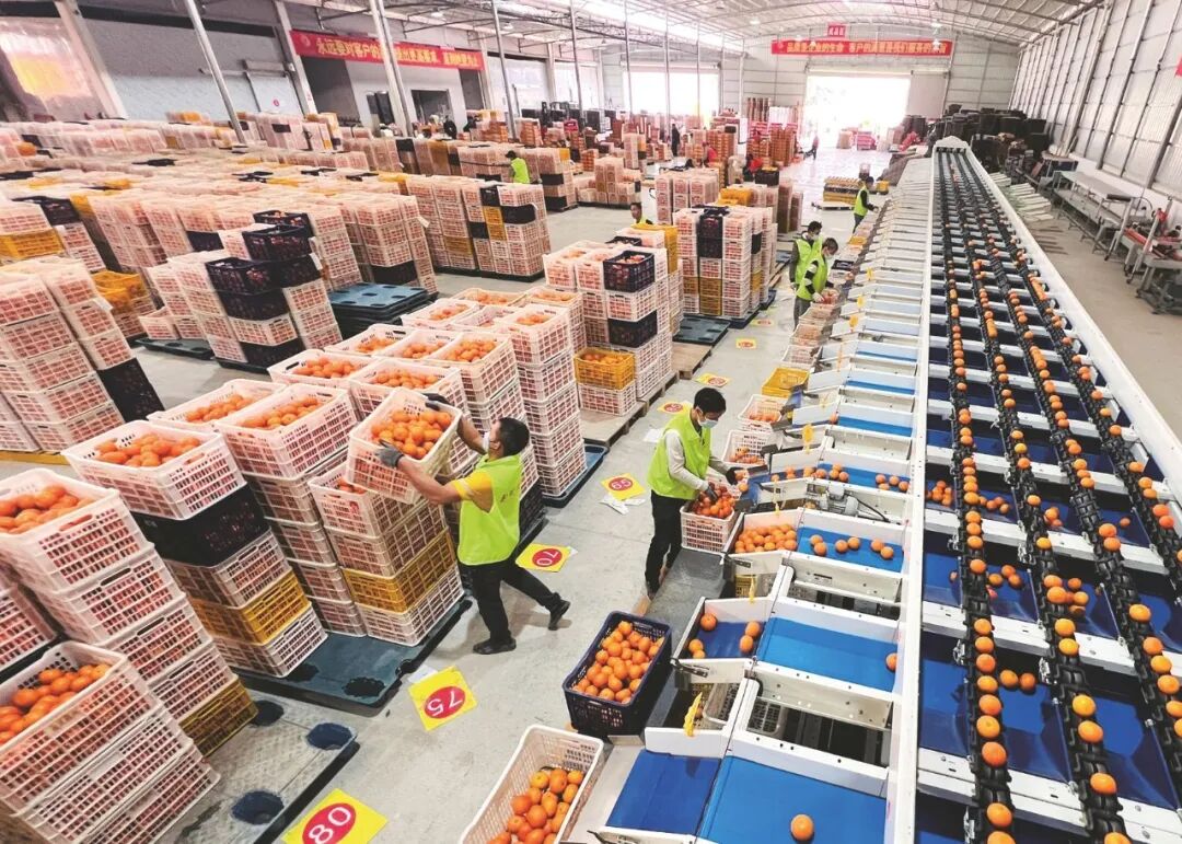 沃柑自动化分拣线上,工作人员对沃柑进行清洗分拣。