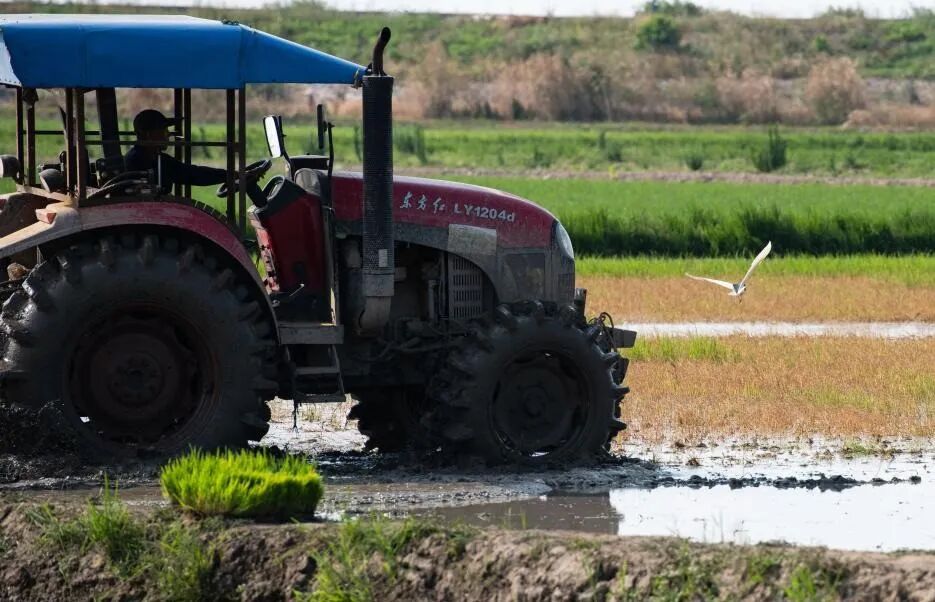 在安徽省巢湖市槐林镇的巢湖岸边,旋耕机在水稻田里作业。图源:新华社