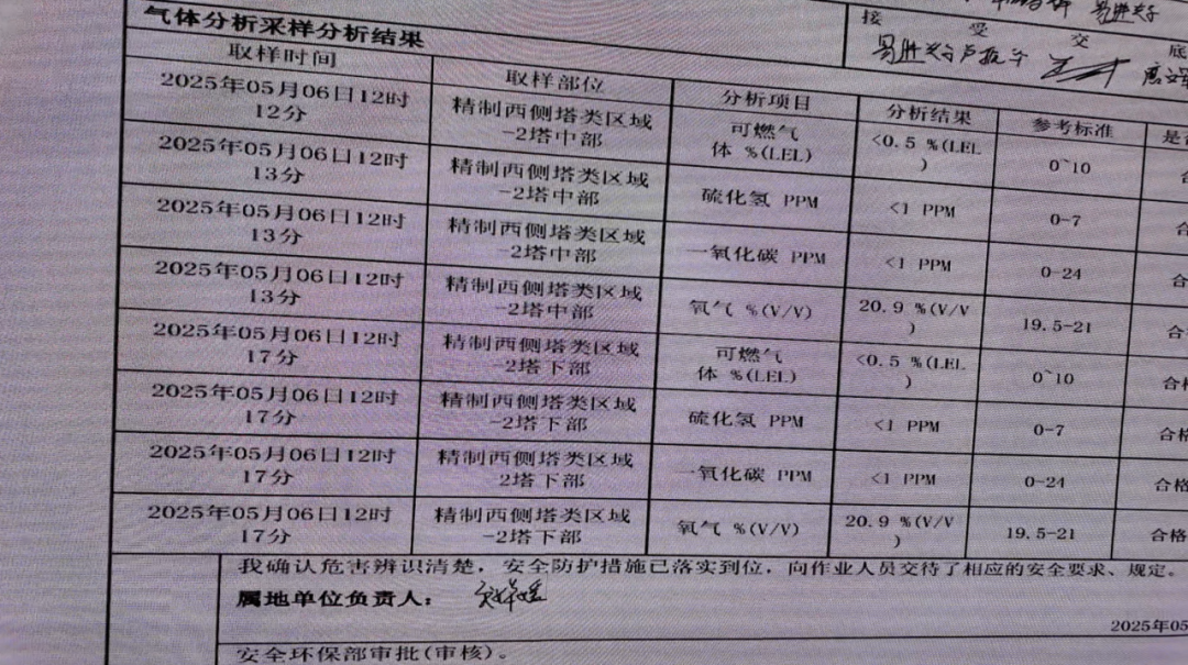这是一张内容为“DMO精制2塔内部检查修复”的受限空间作业票,其中涉及的隐患包括作业环境不良、气体检测位置不合理、未关联相关作业票等。而未对精制西侧塔类区域-2塔上部进行气体分析检测,则违反了《危险化学品企业特殊作业安全规范》中的相关规定。“一旦在上部发生气体积聚,是非常容易造成人员中毒的,这是不容忽视的问题啊。”专家严肃地说道。