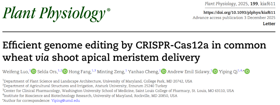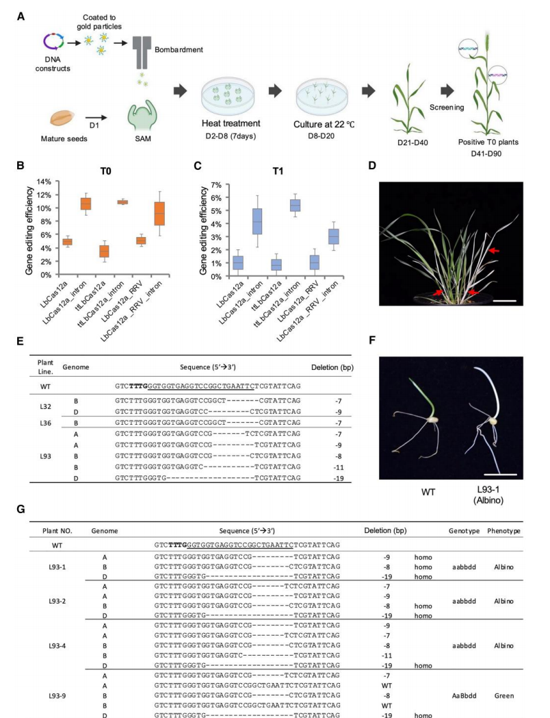 本研究主要针对普通小麦(Triticum aestivum) 中CRISPR-Cas12a系统编辑效率低的问题,提出并验证了一种高效的基因编辑策略。通过顶端分生组织(Shoot Apical Meristem, SAM)递送结合温度优化与内含子优化的Cas12a变体,显著提高了小麦中Cas12a介导的基因编辑效率。