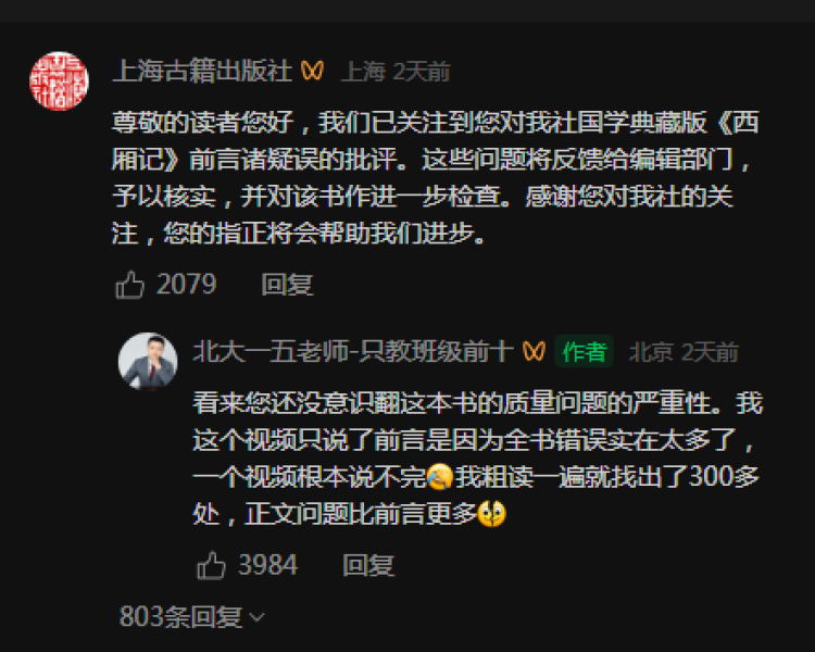 12月2日,上海古籍出版社在这位博主的视频评论区回应称:“尊敬的读者您好,我们已关注到您对我社国学典藏版《西厢记》前言诸疑误的批评。这些问题将反馈给编辑部门,予以核实,并对该书作进一步检查。感谢您对我社的关注,您的指正将会帮助我们进步。”