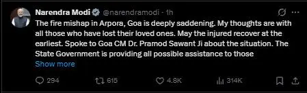 莫迪在贴文中表示:“果阿邦发生的火灾令人深感悲痛。我向所有失去亲人的家庭致以慰问,愿伤者早日康复。我已就此事与果阿邦首席部长普拉莫德·萨万特沟通,当地政府正为受灾民众提供一切必要援助。”