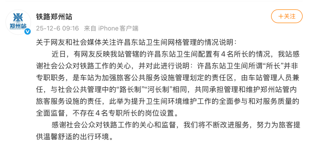 12月6日,@铁路郑州站 发布《关于网友和社会媒体关注许昌东站卫生间网格管理的情况说明》,详情如下: