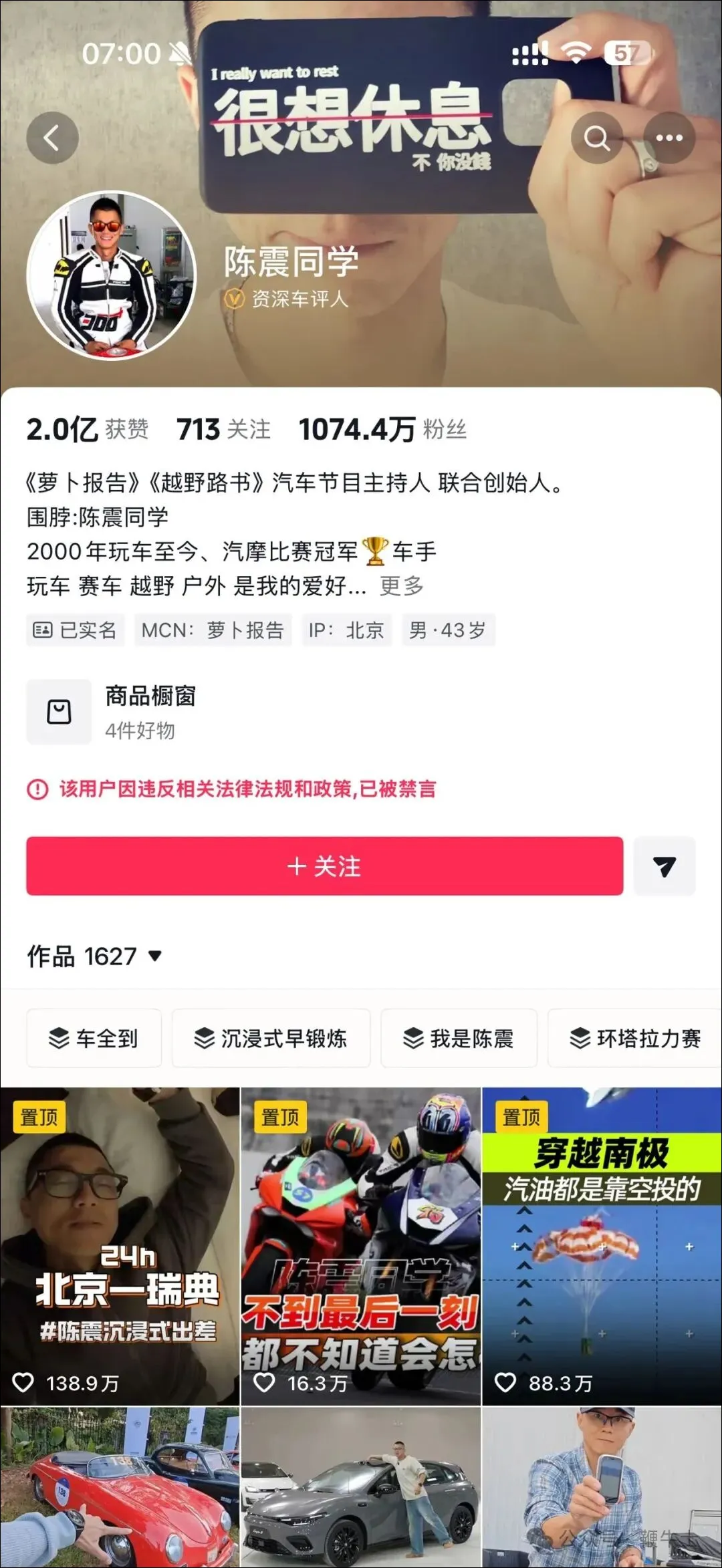 12月4日深夜,不少网友发现,车圈大V陈震突然被禁言。微博、抖音、快手、小红书平台显示,该用户因违反相关法律法规和政策,已被禁言。B站则显示账号已被封禁。