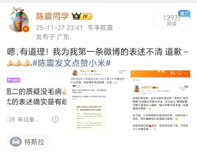 11月27日上午,“小米公益基金会”官微宣布,香港小米基金会捐赠1000万港元,紧急驰援香港大埔火灾救援。随后,#雷军回应小米基金会捐1000万港元#话题登上微博热搜,知名大V、汽车博主陈震带话题发布微博称:“不管出于什么原因,但这事本身没得黑,点赞~”网友质疑其“阴阳语气”抹黑小米。随后没多久,他再发布微博就之前表述致歉,称“第一条微博表述不清,道歉。”