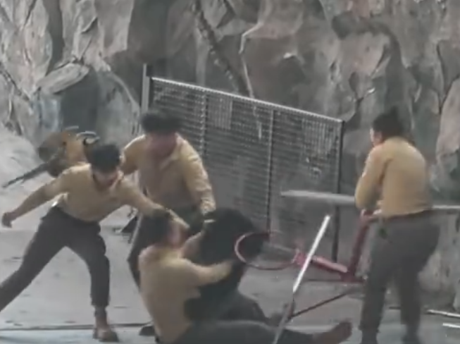 12月6日,杭州野生动物世界一只黑熊在上台表演节目前扑倒表演者,事发后多人上前将黑熊拉开。