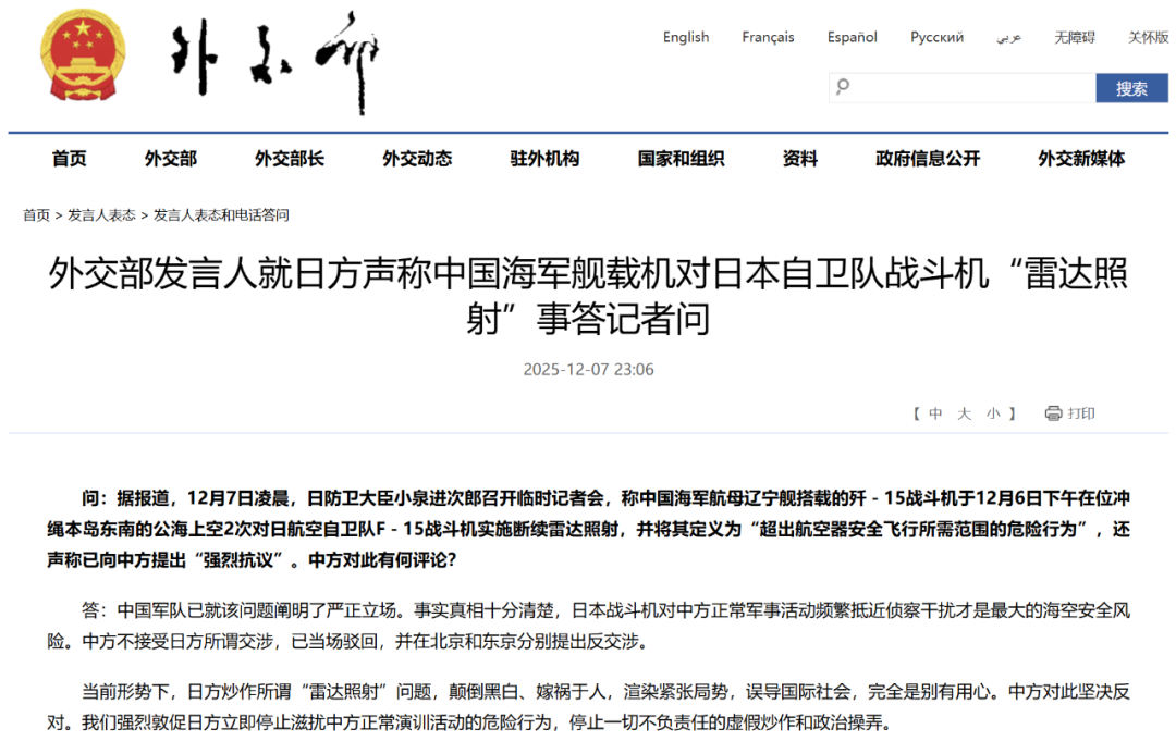问:据报道,12月7日凌晨,日防卫大臣小泉进次郎召开临时记者会,称中国海军航母辽宁舰搭载的歼-15战斗机于12月6日下午在位冲绳本岛东南的公海上空2次对日航空自卫队F-15战斗机实施断续雷达照射,并将其定义为“超出航空器安全飞行所需范围的危险行为”,还声称已向中方提出“强烈抗议”。中方对此有何评论?