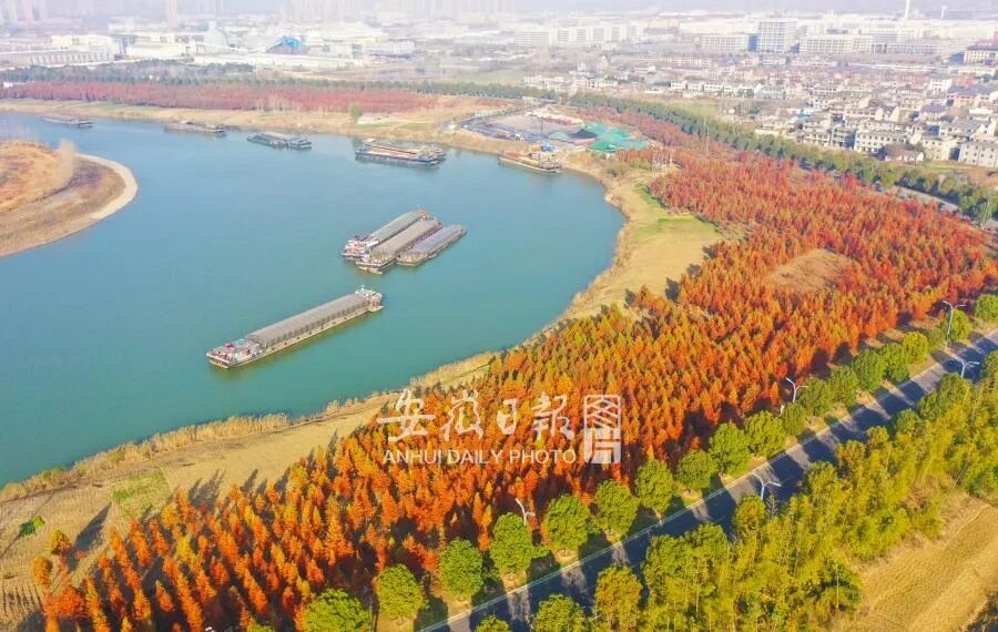 12月6日,阜阳市颍上县夏桥镇龙王庙社区,河流、村庄、道路与水杉林交融辉映,勾勒出如梦似幻、色彩浓郁的冬景之美。王林洪 摄