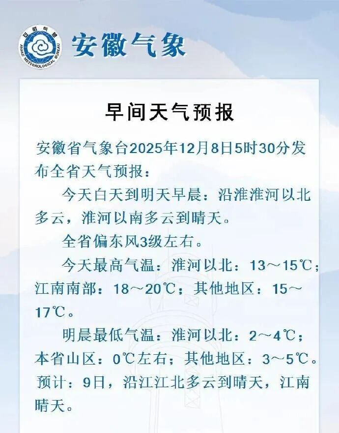 ●据安徽气象台消息,12月11日前全省以晴到多云天气为主;受冷空气影响,12日全省有一次降水过程;13日全省阴天。受弱冷空气影响,8-9日全省气温略有下降。10-11日全省气温再次回升,其中11日淮河以北、江淮之间北部和大别山区最高气温16~19℃,其他地区20~23℃。受寒潮天气影响,11日下午至13日安徽自北向南有一次大风降温天气过程,全省平均气温将下降8~11℃,同时风力增大到4级左右,阵风7~8级。●12月7日,合肥市教育局发布《合肥市教育局关于深化高中阶段学校考试招生制度改革的实施意见(征求意见稿)》《合肥市市区初中学业水平体育与健康学科考试实施方案(征求意见稿)》,向社会公开征求意见,此次征求意见的时间为10天。详情>>