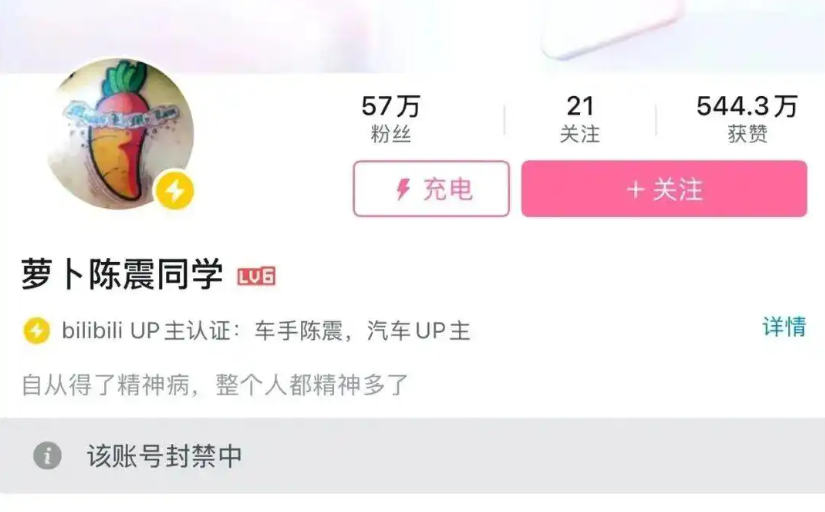 12月4日深夜,陈震多个社交媒体平台账号被禁言。图为陈震B站账号禁言提示