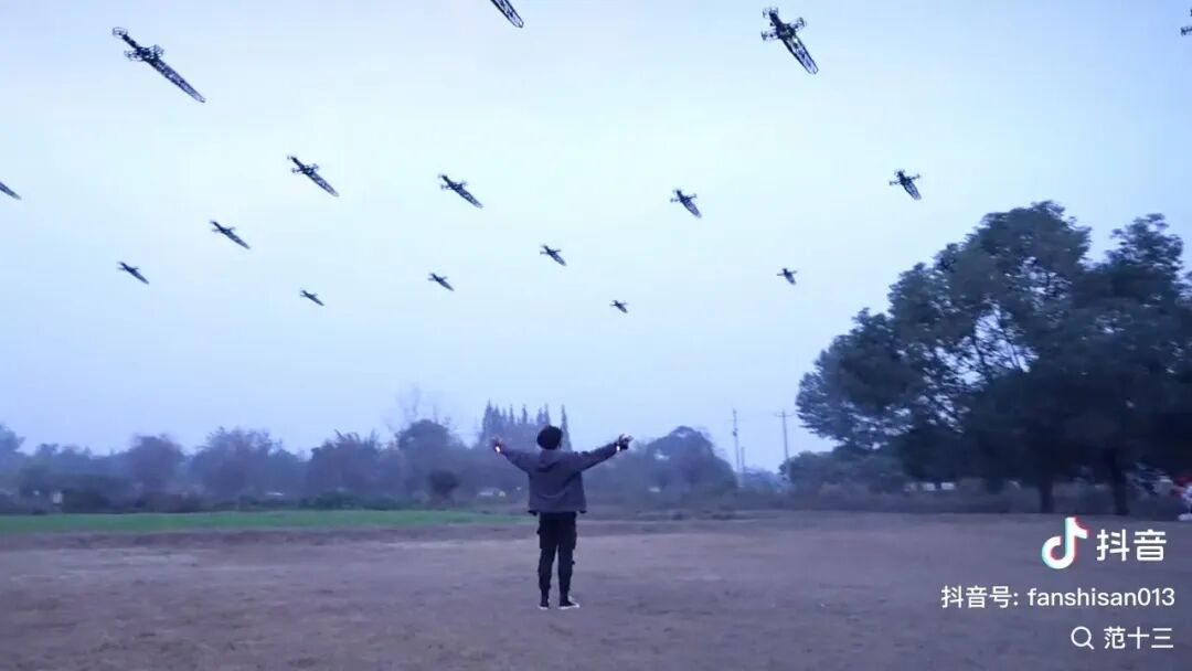 “范十三”拍摄的“万剑归宗”,有一幕令人印象深刻:飞剑掠过农田,正在劳作的农民纷纷抬头,露出了惊讶的表情。这不是提前安排好的画面,而是拍摄过程中的即兴之举。原来,在在勘景途中,团队发现一片村民正在采摘蔬菜的农田,临时决定在此试飞。“我们没打招呼,就想看看最真实的反应。”结果令人惊喜:“他们完全不知道是怎么回事,有人还以为是拍电影。”