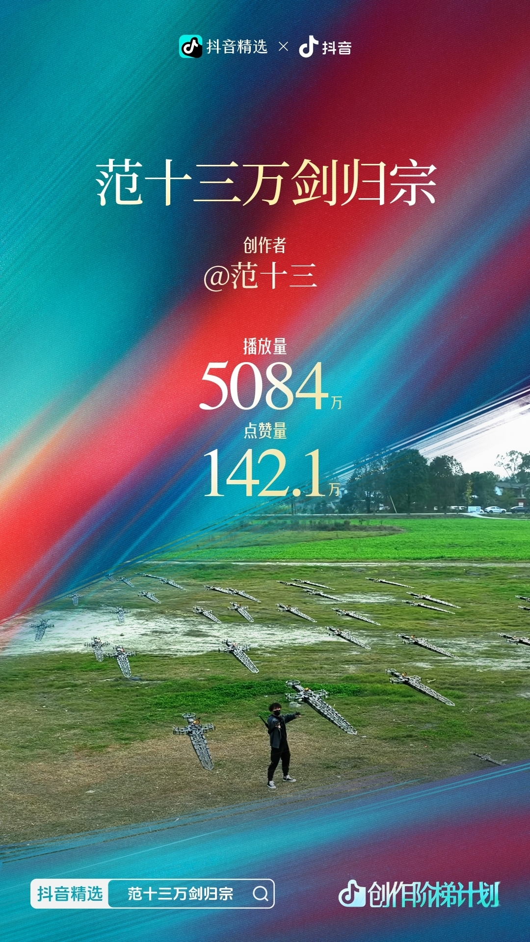 近日,“范十三”又火了一把。11月30日,“范十三”发布了一条视频,他以手势“御剑”,30多把“飞剑”腾空而起、听令而动、气势恢宏,将武侠文化中极具象征意义的“万剑归宗”具像化。视频一发布,迅速引爆网络,网友称他用科技圆梦武侠,更是“赛博修仙”的终极演绎。目前,该抖音视频播放量已超5000万,获赞超160万。