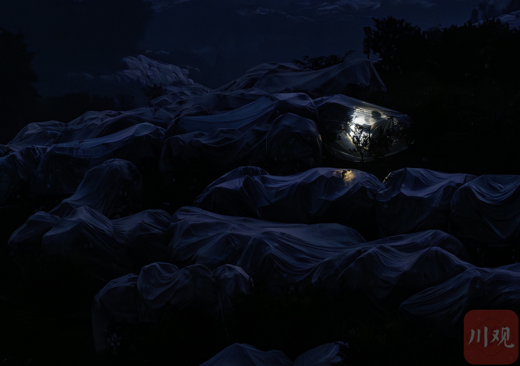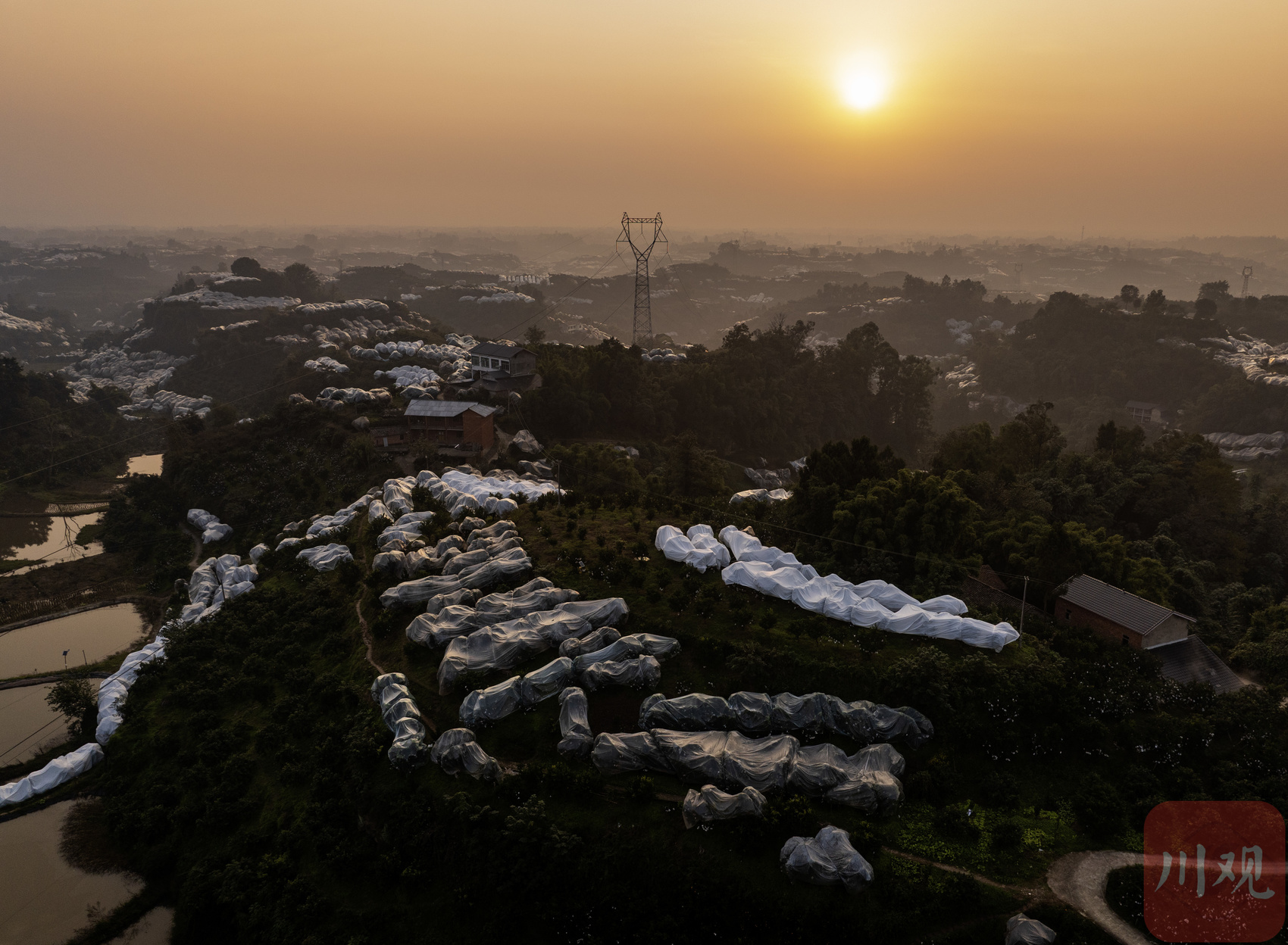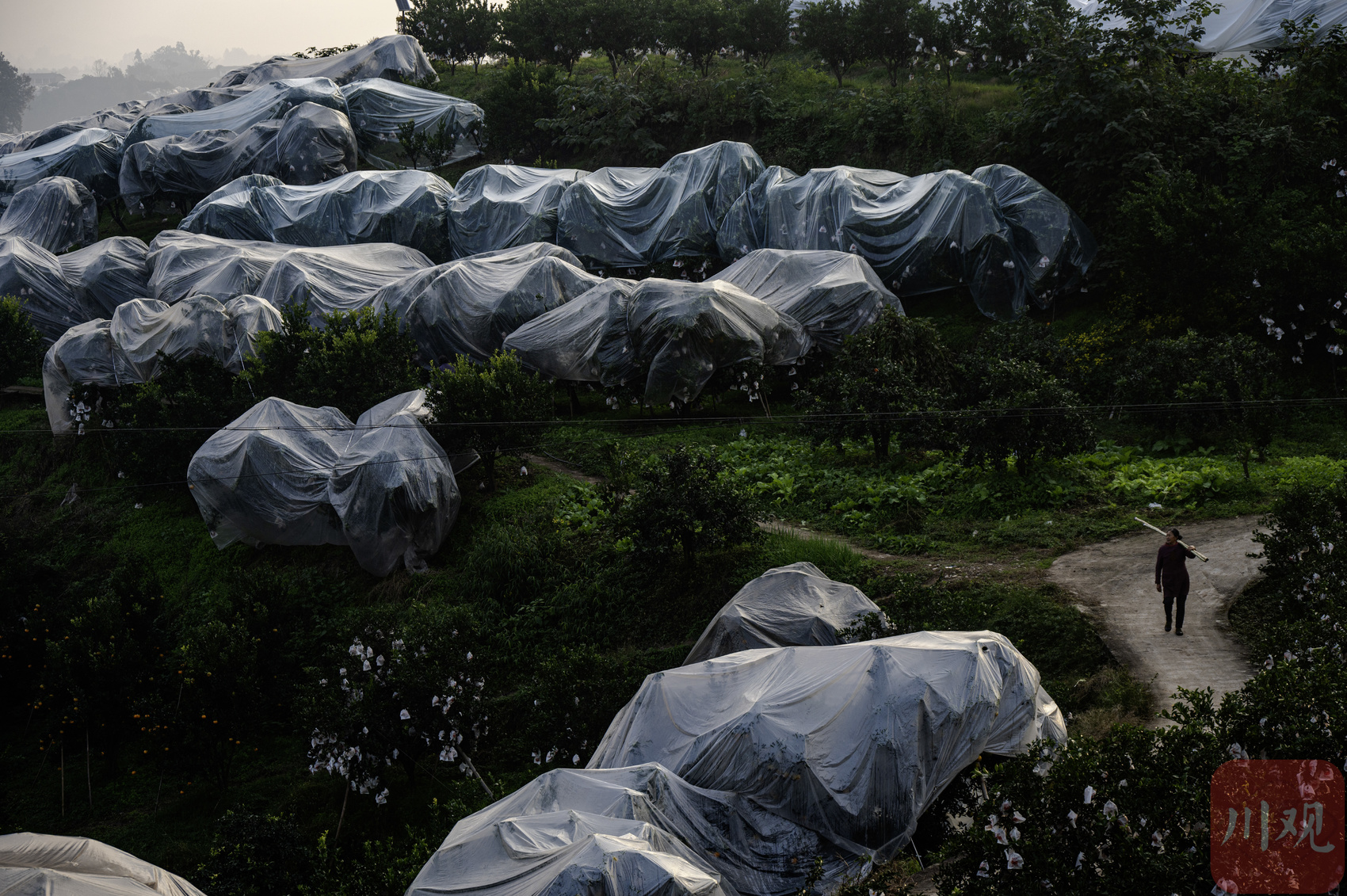 柑橘披纱衣,覆膜锁鲜甜,果农夜里忙,难掩满心欢。