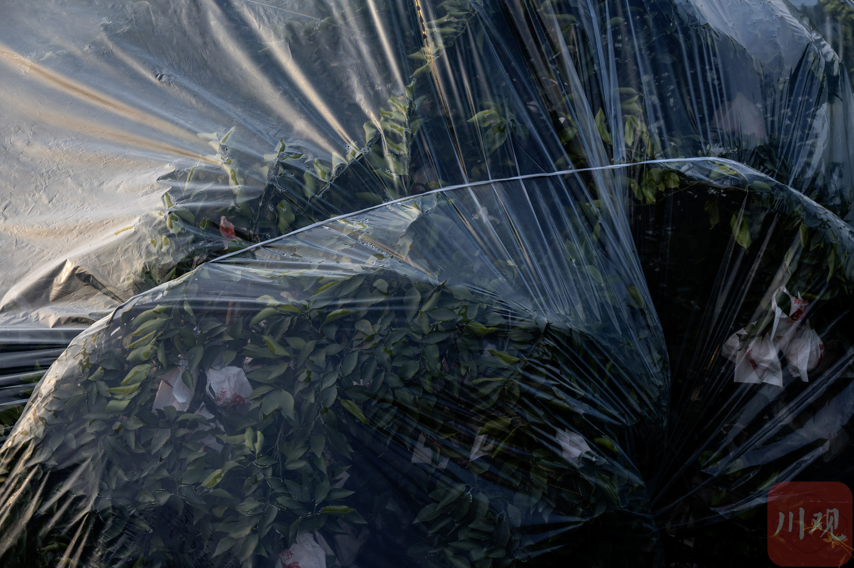 12月7日,自贡市荣县留佳镇小田村的果园里一派繁忙景象。果农们手托薄膜,熟练地为柑橘树进行覆膜防护。轻薄的覆膜如纱似雾,轻轻覆盖在树冠之上,宛如为果树披上了一身洁白的纱衣。