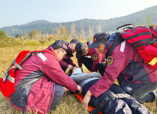演练启动后,应急指挥组快速响应、精准调度,各参演小组迅速集结、分工协作,依次完成临时指挥点搭建、被困伤员搜救转移,规范开展红黄绿黑四级伤情分类标识,扎实做好止血、包扎、固定等现场急救处置,同步严格遵循“危重优先、分类转运”原则,有序将伤员转运至定点医疗机构,实现救援指令传达、现场处置、医患交接全链条高效衔接,充分展现了救援队伍过硬的实战能力。