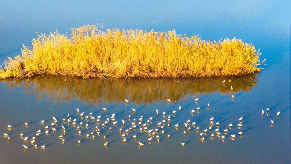 12月8日,群鸟在江苏兴化里下河国家湿地公园内栖息、觅食(无人机照片)。