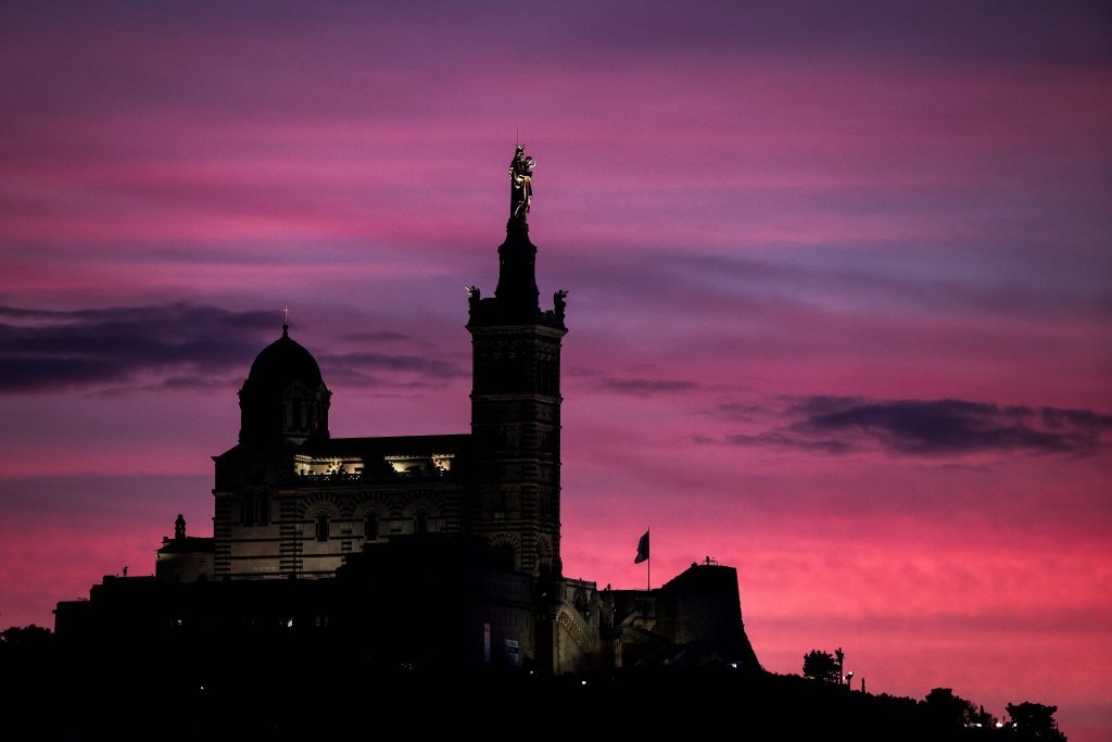 这是12月7日日落时分在法国马赛拍摄的圣母加德大教堂景色。