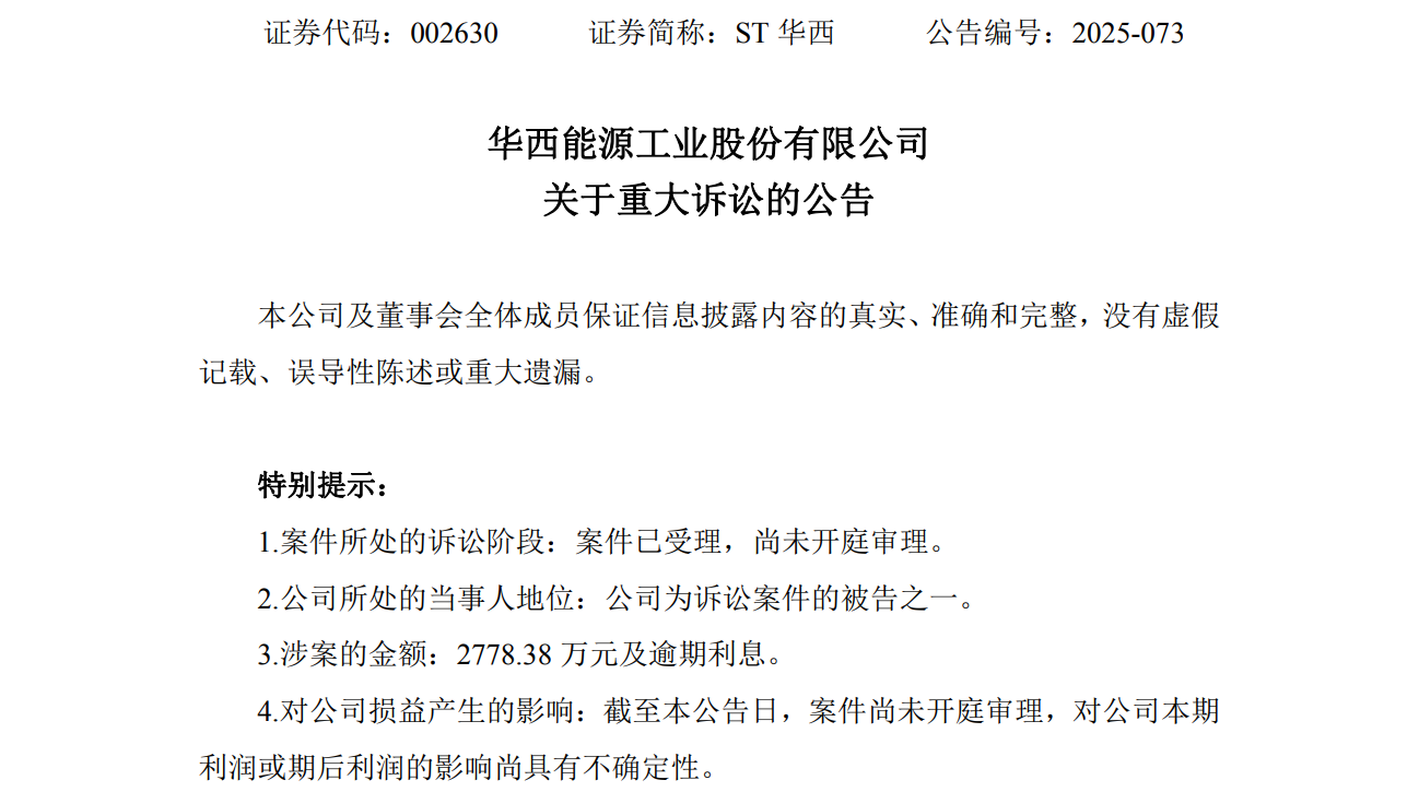 此次纠纷并非ST华西近期面临的孤例。今年以来,ST华西已卷入多起作为被告或共同被告的诉讼案件,案件多围绕历史项目的工程款或货款结算争议,且涉案金额普遍较高。