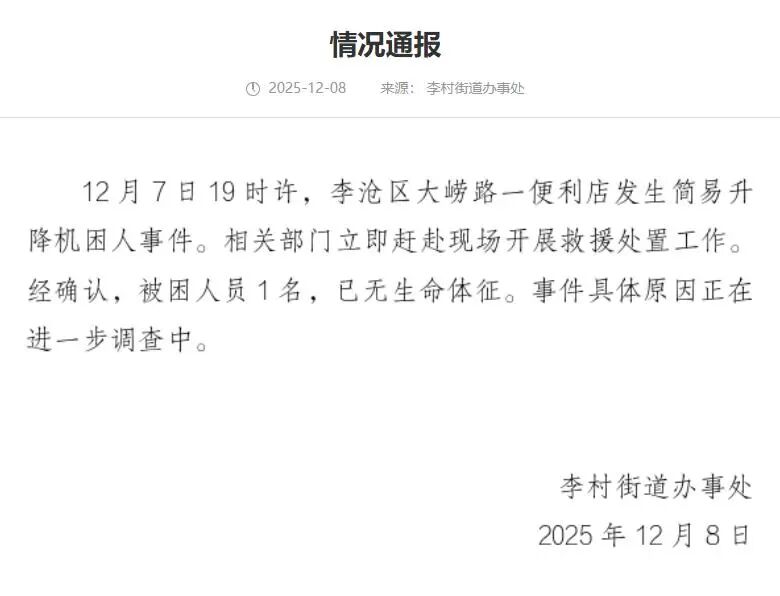 据青岛李沧政务网,12月8日,李村街道办事处发布情况通报:12月7日19时许,李沧区大崂路一便利店发生简易升降机困人事件。相关部门立即赶赴现场开展救援处置工作。经确认,被困人员1名,已无生命体征。事件具体原因正在进一步调查中。