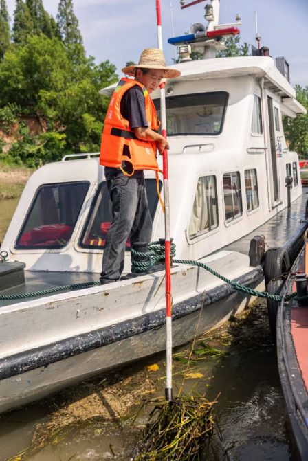 清理草渣是力气活,更是苦活。汛期正是高温季节,航标船的甲板被太阳晒得发烫,站在船头清理草渣既使不上力,又不安全。李振祥常在腰间绑上一根绳,同事在后方拉住他,他直接趴在船头,半截身子探下去,用手抱、用刀砍、用钩子钩,一点点将草渣清除。有时草渣太沉,一干就是一个多小时,他也从来不叫苦不叫累。