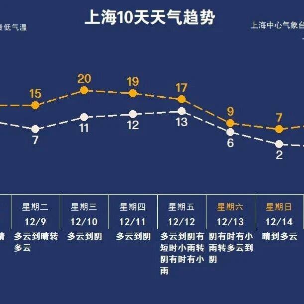 周末(12月13日起):一股较强冷空气抵沪,将带来明显大风降温和降水过程。届时气温将被压制在个位数,上海可能借此正式开启入冬进程。