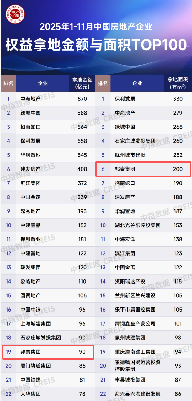邦泰集团此次拿地,放在其全年扩张版图中更具代表性。据中指研究院数据,2025年1-11月,邦泰集团已拿地24宗,权益拿地金额90亿元,位列全国第19名;拿地面积200万平方米,排名全国第6,位居民营房企第1名,成为今年土地市场当之无愧的“黑马”。