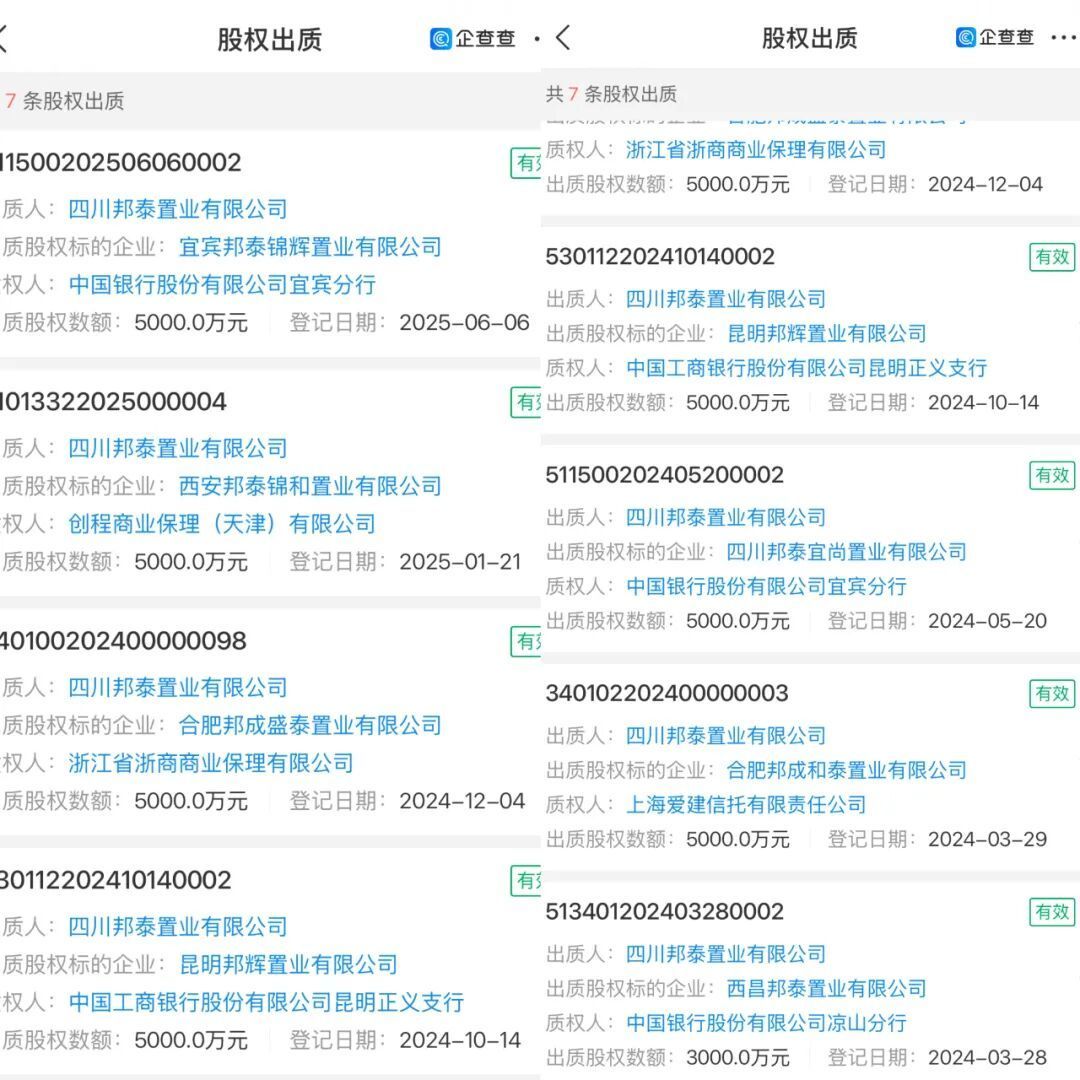 尽管拿地与销售表现亮眼,但邦泰集团扩张背后的风险也不容忽视。据企查查,邦泰置业在2024-2025年间,有7笔股权出质信息,先后将7家子公司作为标的质押给银行或金融公司,金额为3.3亿元。历史出质则超过40笔。在邦泰置业控股的数家子公司中,也有近半数有过股权出质行为,融资对象涵盖银行、信托及其他金融机构。