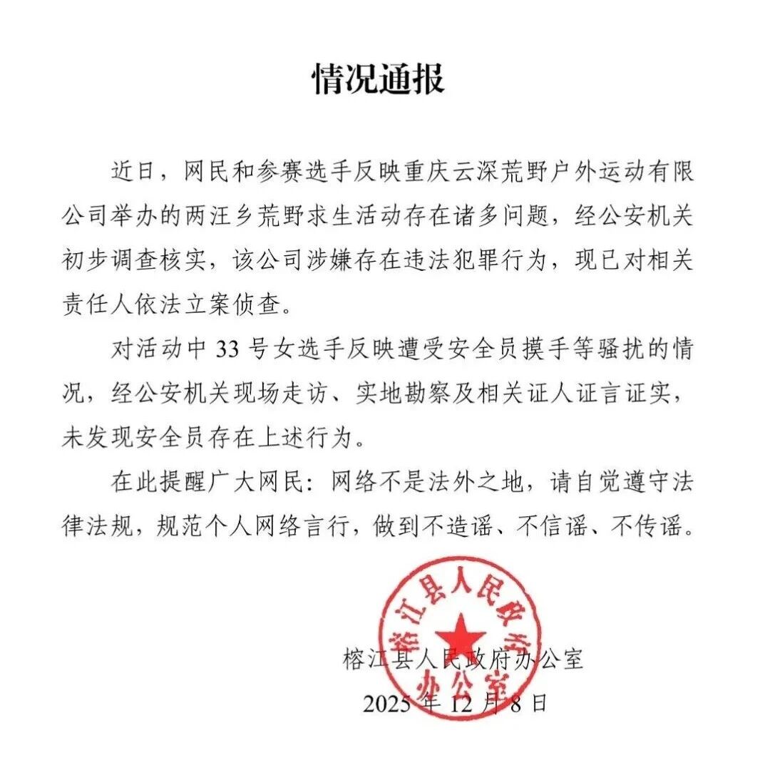 近日,网民和参赛选手反映重庆云深荒野户外运动有限公司举办的两汪乡荒野求生活动存在诸多问题,经公安机关初步调查核实,该公司涉嫌存在违法犯罪行为,现已对相关责任人依法立案侦查。